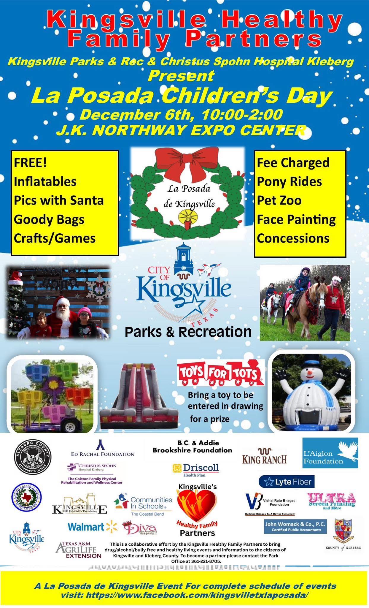 La Posada de Kingsville has been a tradition in the town for 36 years. The main attractions include Children’s Day from 10am – 2pm at the Maggie Salinas Pavilion followed by the annual the Parade of Lights. The parade features over 100 floats, each illuminated with hundreds to thousands of lights as they make their way along the parade route. Local high school marching bands, surrounding communities and a host of other organizations typically also participate in the parade. Come on down to our South Texas city and join in the annual festivities that make up La Posada de Kingsville!